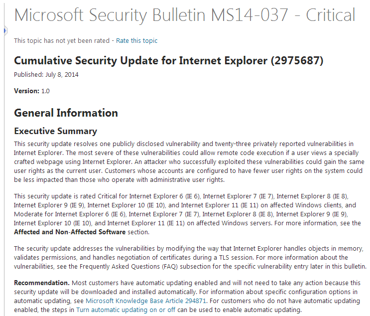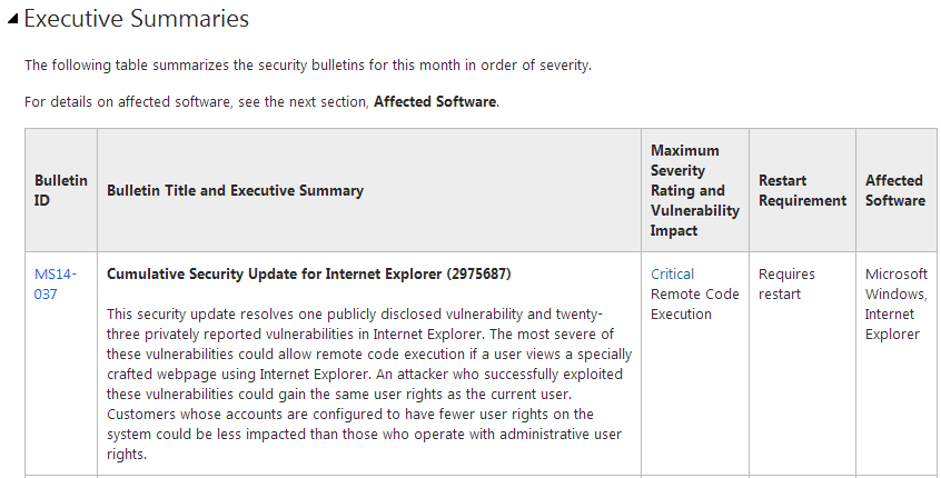 Click the link in the Bulletin ID field. The Security Bulletin for that patch opens. In this example, Security Bulletin MS14-037 opens: