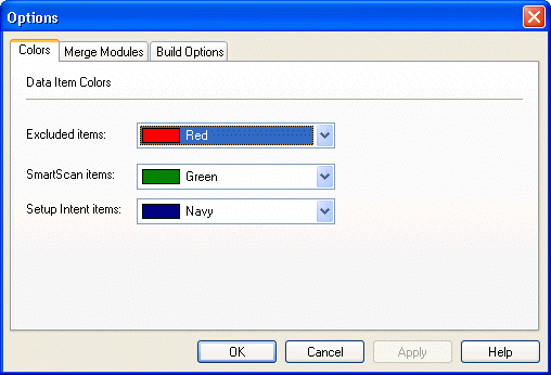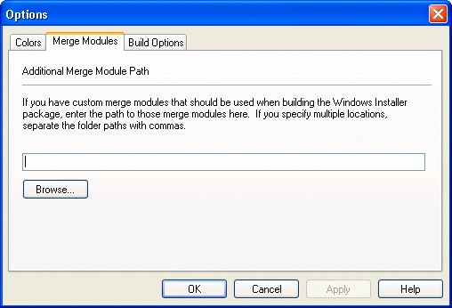 The Options dialog box, available from the Tools menu, presents options on three tabs: Colors, Merge Modules, and Build Options.