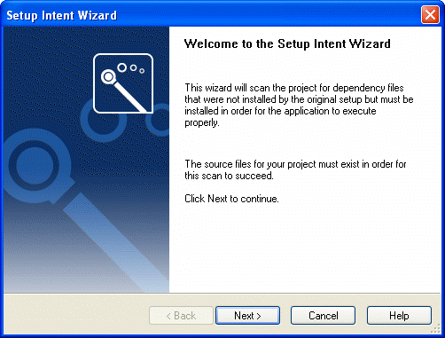 The first panel in the Setup Intent Wizard informs you the purpose of the Wizard, and warns you the source files for your project must be present for successful scanning.