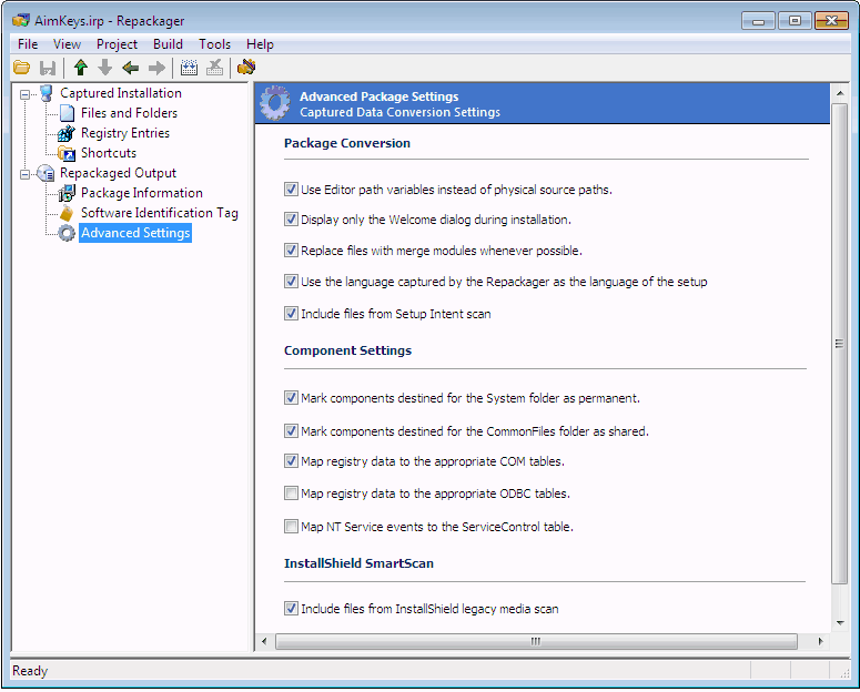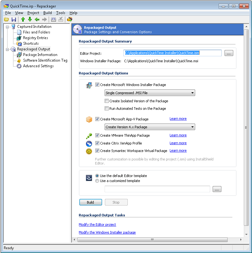 You can simultaneously build an InstallShield Editor project (.ism) and a Windows Installer package (.msi) from your Repackager project (.irp). However, before you do so, you must configure options in your Repackager project necessary for the build.