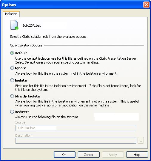 DefaultUse the default isolation option for this file as defined on the Citrix XenApp. Select this option unless you require specific custom handling.