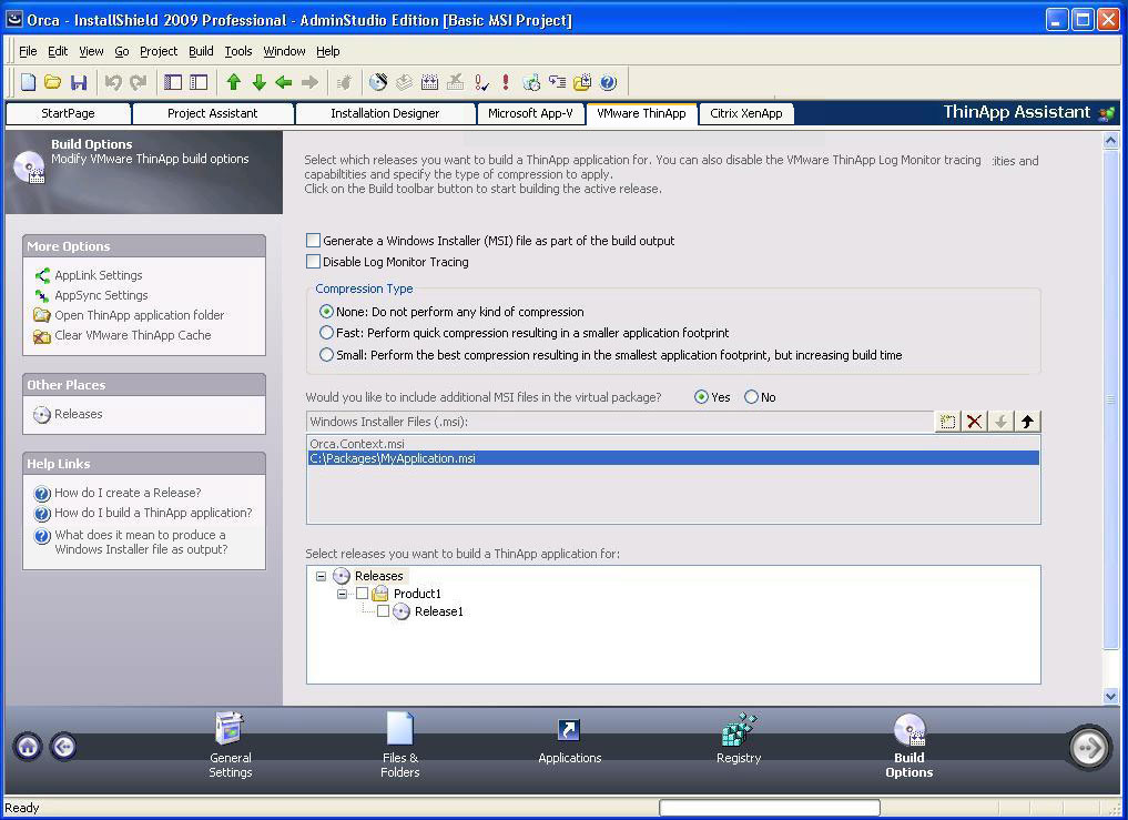 Active release selected—A Windows Installer package and a ThinApp application would be built.