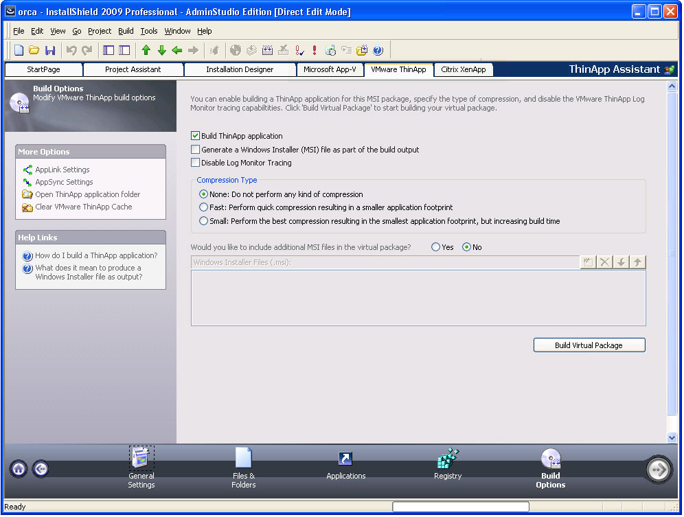 However, you do need to run the build process to build a ThinApp application for this Windows Installer package. To enable the Build button to build just the ThinApp application, select the Build ThinApp application option on the Build Options page.