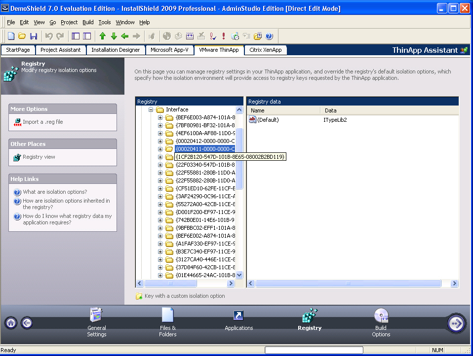 The default settings for isolation options are built into the ThinApp Assistant, and those defaults are adequate for most environments. However, you can override the default settings for selected registry keys to exert control over application interactions with client operating system resources.