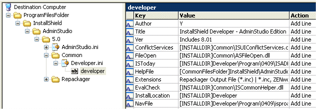 2. In the INI File tree, select the INI file that you want to edit, and expand the listing so that you can select the appropriate section. That section’s keys, values, and actions are listed: