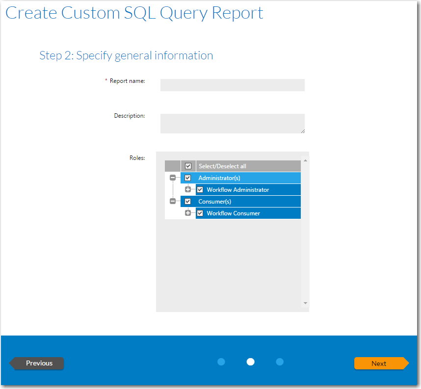 Enter a Report name and Description to clearly identify the contents and purpose of this report. This name and description will be listed on the All Reports page.