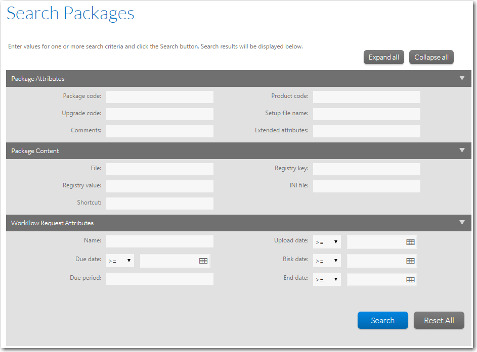 In the Search Packages area of the Search Packages page, expand the criteria category that you want to use by clicking the arrow. When all three categories are expanded, the following fields are available: