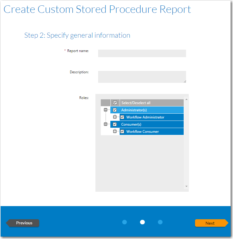 In the navigation bar, click Create Custom Stored Procedure Report on the Reports menu. The Step 1: Select Stored procedure of the Create Custom Stored Procedure Report page opens.