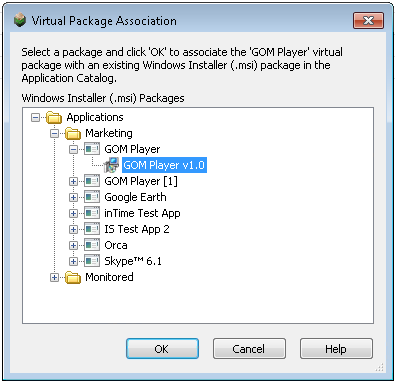 Right-click on the virtual package you want to make an association for, and select Associate Package from the shortcut menu. The Virtual Package Association dialog box opens, listing Windows Installer packages in the Application Catalog.
