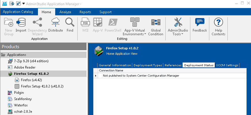 The Deployment Status tab of the Home Application View lists data from ConfigMgr (Formerly called as System Center Configuration Manager) that is specific to this application, not to its deployment types. The data is read from the active ConfigMgr (Formerly called as System Center Configuration Manager) server that has been specified on the Server Options > Distribution System tab of the Application Manager Options dialog box.