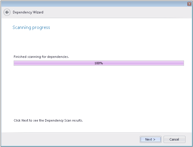 The Scanning Progress panel opens when you begin a dependency scan and shows the progress. When scanning is complete, you are prompted to click Next to see the results of the dependency scan.