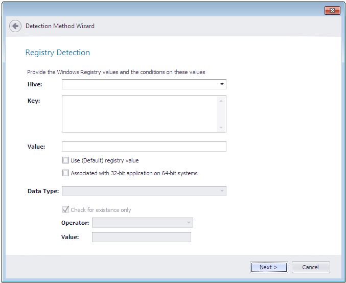 On the Registry Detection panel, which opens if you selected Registry on the Welcome panel, you enter the Windows Registry information and the conditions to be applied on those values.