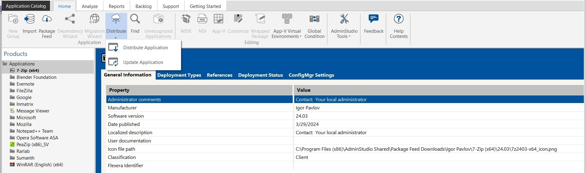 1. In the Application Catalog tree, select the application or group of applications, and click the Distribute drop down in the ribbon and select Distribute Application or right-click and select Distribute Application from the context menu.