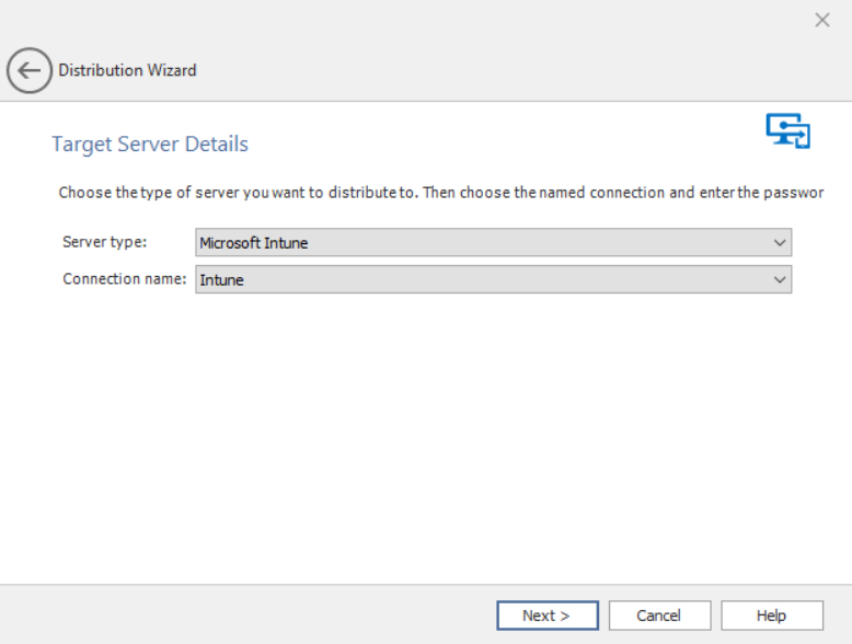3. On the Target Server Details panel, select the required Connection name from the drop down, and then click Next. ![](/images/Distribution Wizard.PNG)