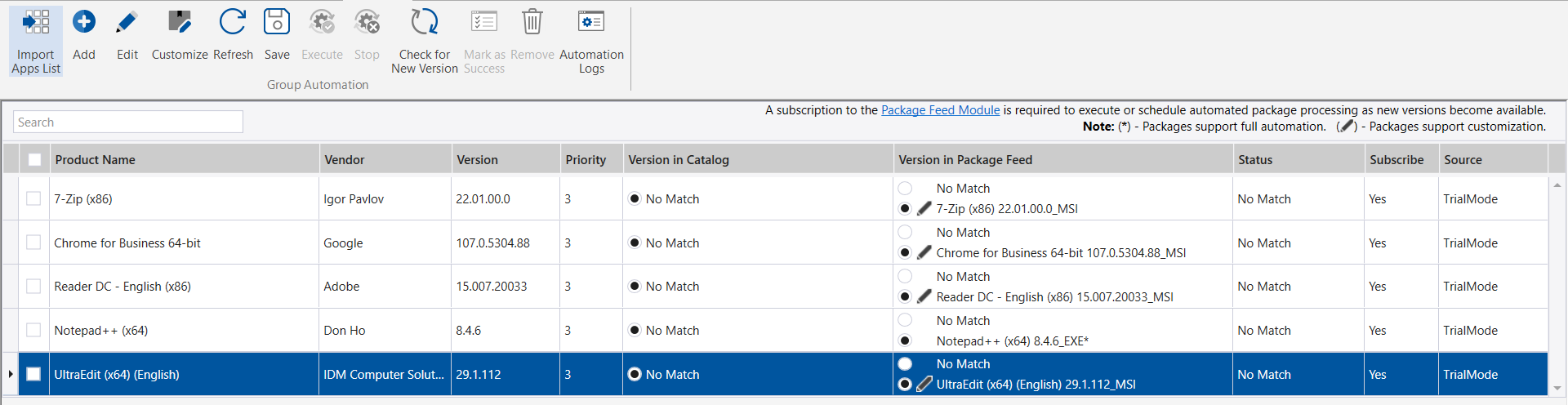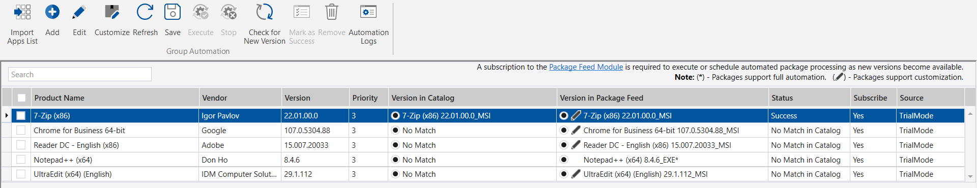 All the Package Feed Module trial packages are by default subscribed for automation by setting the Subscribe column to Yes. If you wish to change, set the Subscribe column to No.