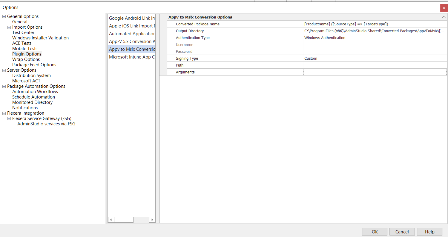 In the middle pane, select Appv to Msix Conversion Plugin. The Appv to Msix Conversion Options are displayed in the right pane.