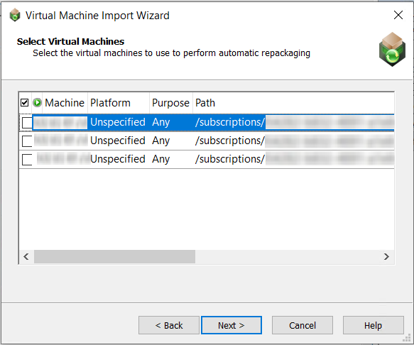 Selection column. To select a virtual machine to use for automated repackaging, click the check box in this column.