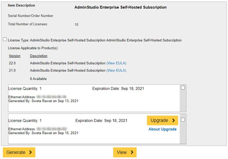 When a new version of AdminStudio 2021 R2 or later is released, click on the Upgrade button in the Product and License Center to generate a new license file for the new version of the product installed in the same machine, upgrading the current version.