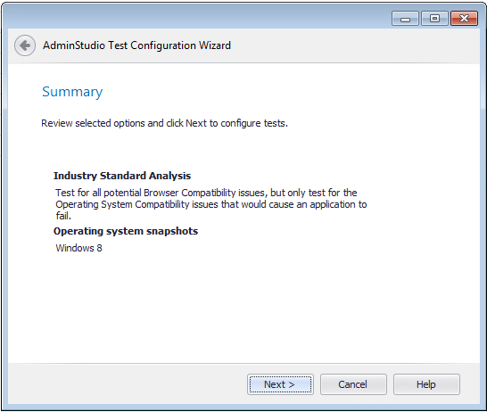 Test Category Change Operating System Compatibility The Operating System Compatibility tests that are selected depend upon the level you chose on the Choose a Compliance Levelpanel. The selection of Operating System Compatibility tests will be further filtered if you selected an OS Snapshot on theOS Snapshot(s)panel. The only Operating System test categories that will have any selected tests will be the categories of the selected operating systems. For example, if you choose a Windows 8 64-bit OS Snapshot, tests will be selected only in theWindows 8 64-bittest category.Application Conflicts Application Virtualization Compatibility Best Practices Risk Assessment Remote Application Publishing Compatibility Test selection in these test categories are not affected by any selections made in the AdminStudio Test Configuration Wizard.