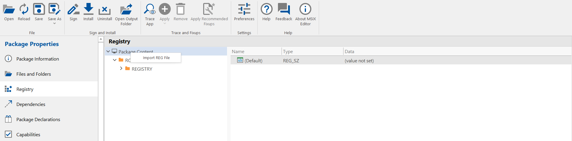 In the Registry pane, right-click on Package Content node, and then select Import REG file.