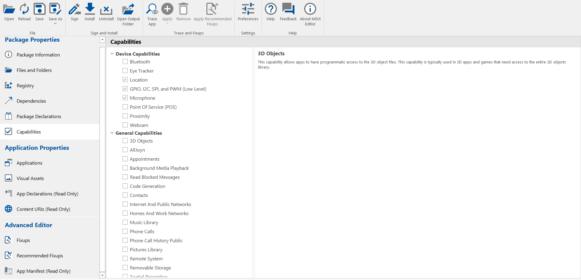 Click on Capabilities view in the left pane view list under Package Properties. The capabilities page appears.