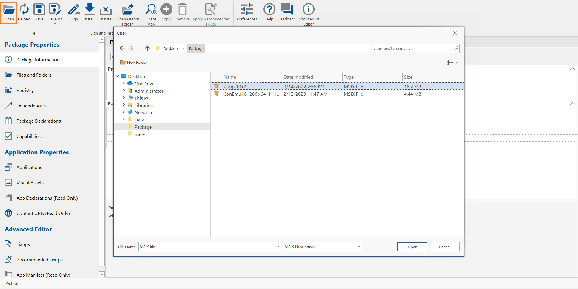 - In the MSIX Editor, click the Open button in the ribbon.
