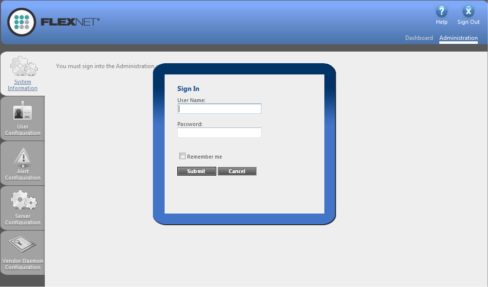 MachineNamerepresents the name of the machine that has the FlexNet Licensing Server software.Portis the HTTP port number that is used to host the Web server; this is configured when the FlexNet Licensing Server software is installed. The default port number is 8090. - If you are using the machine that has the FlexNet Licensing Server, visit the following site: